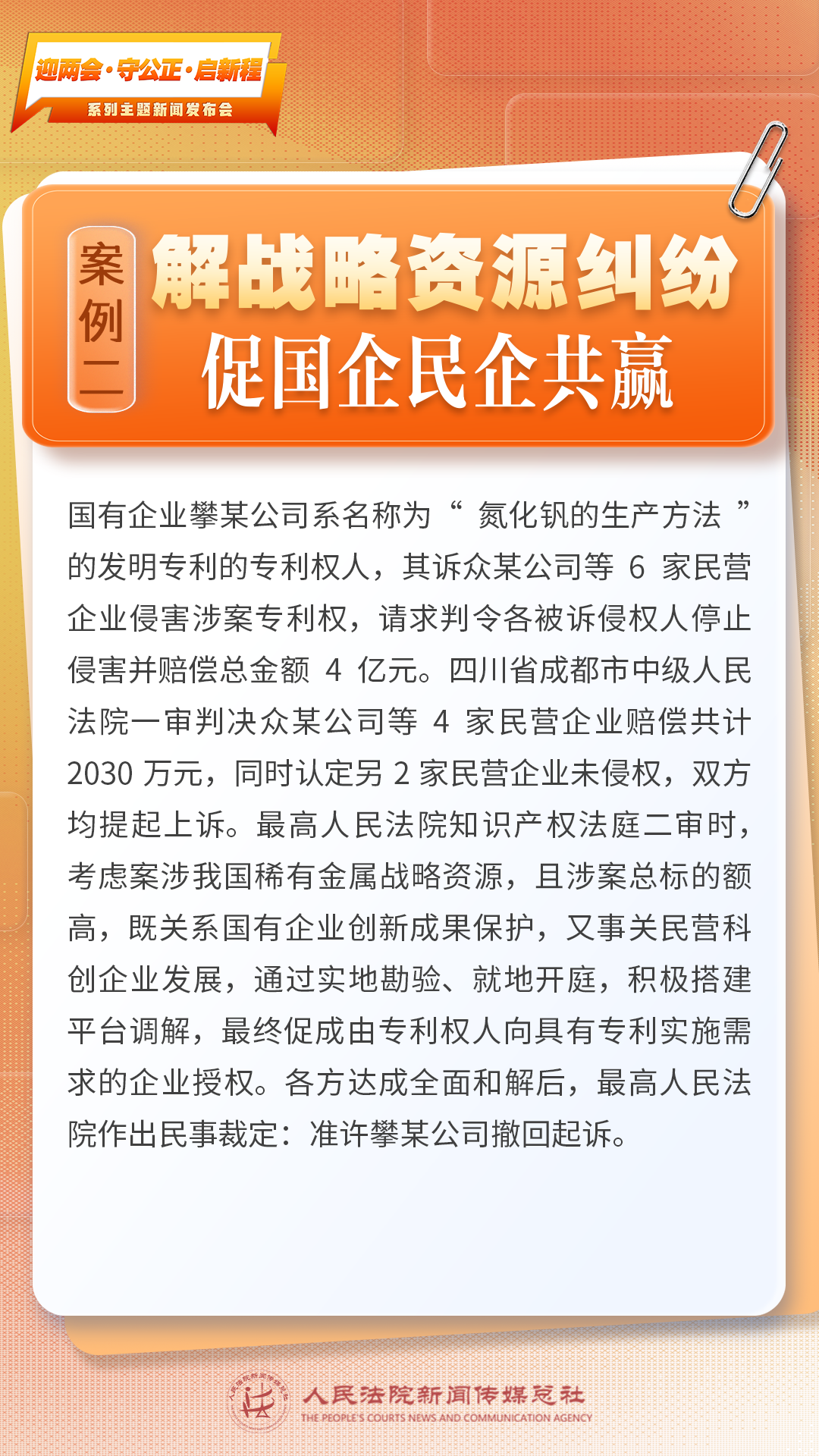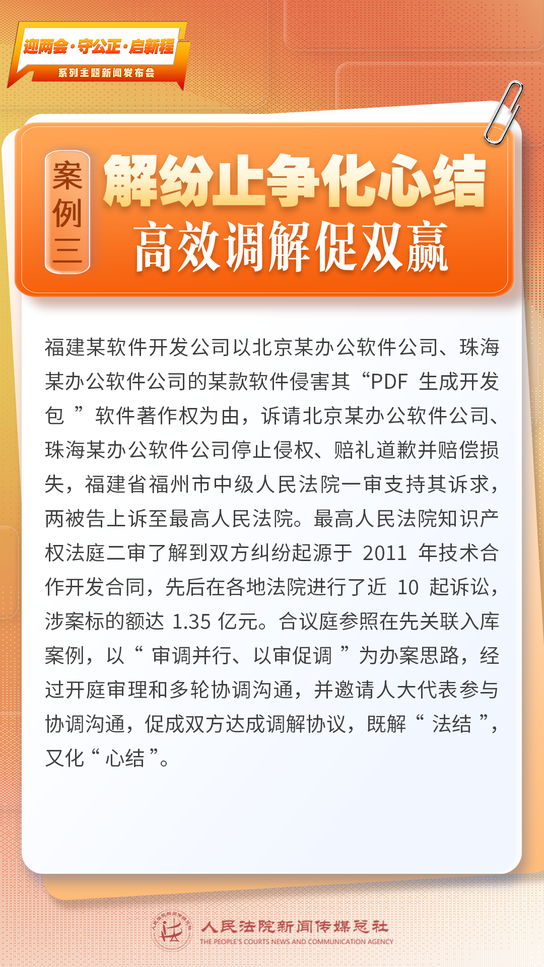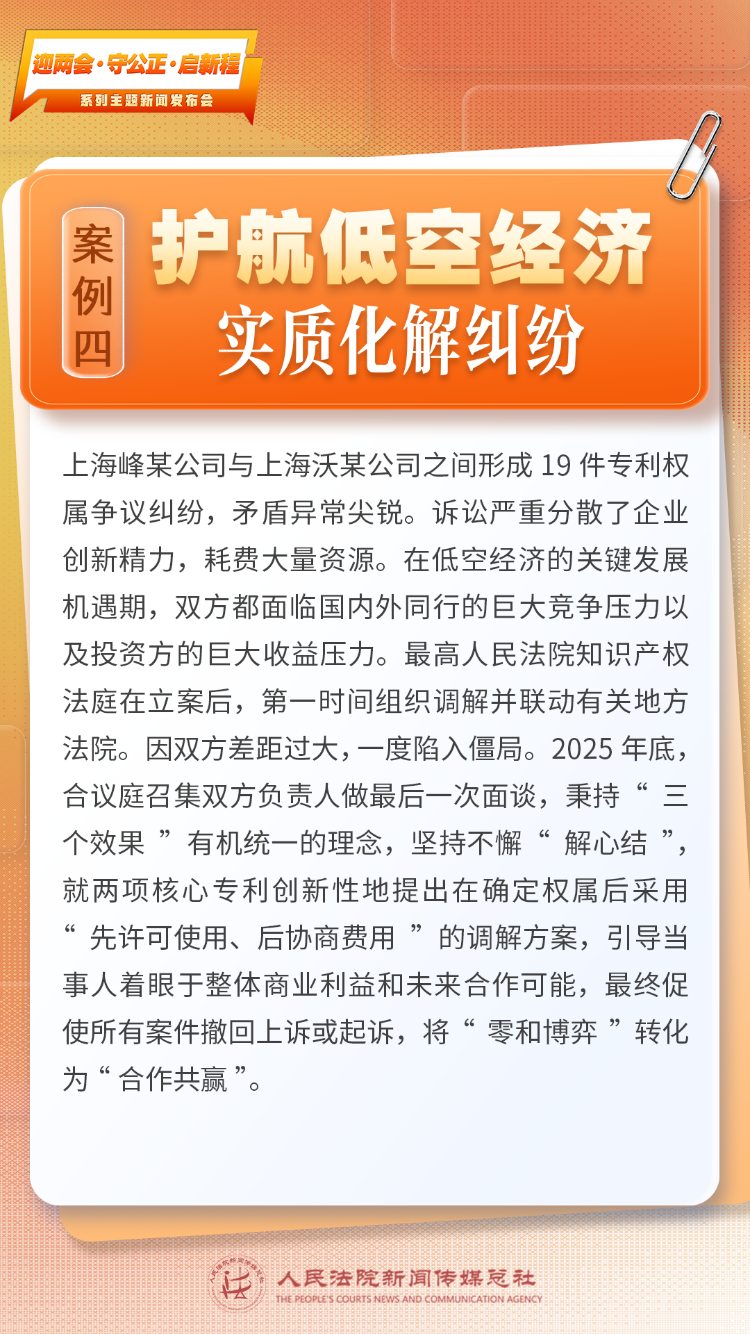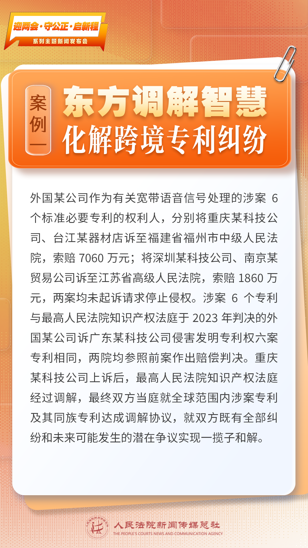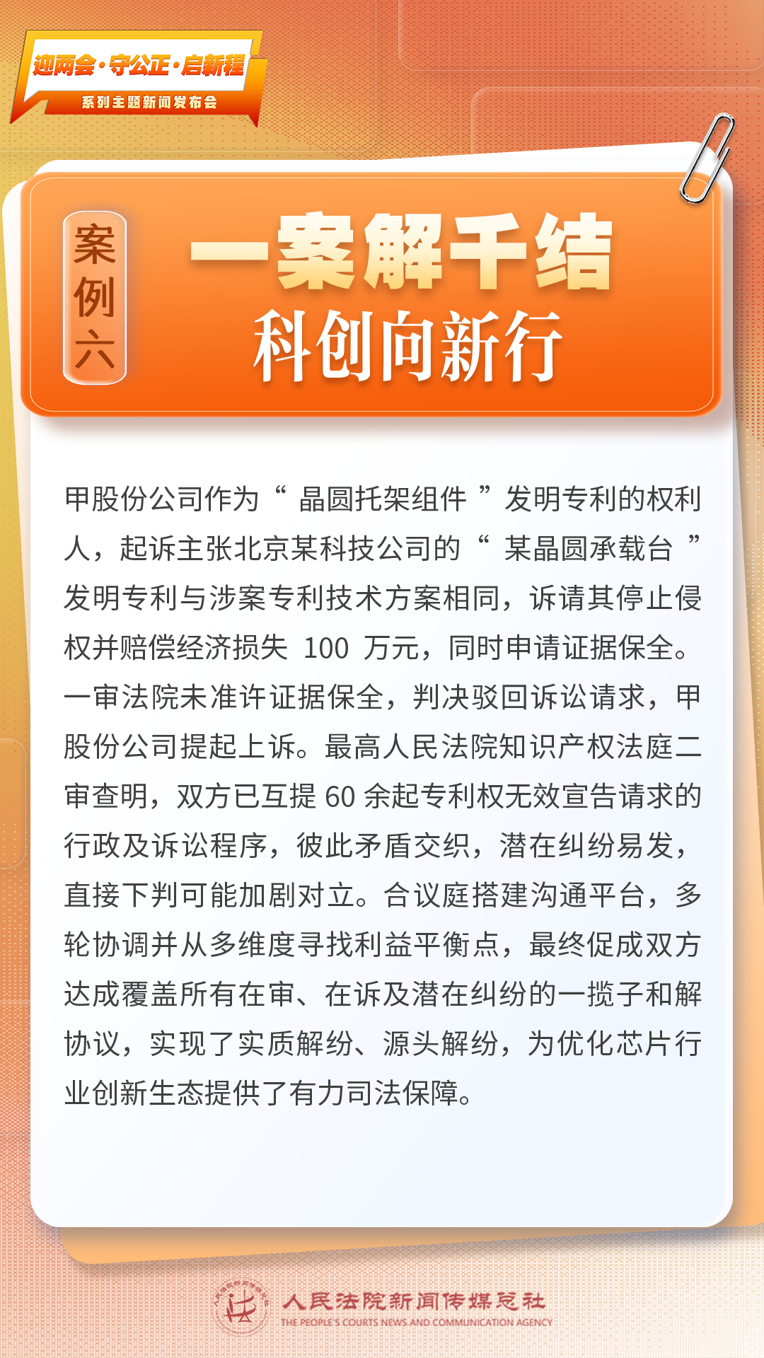 2026年1月28日,最高人民法院召开新闻发布会,发布2025年最高人民法院知识产权法庭调解工作典型案例。在这些案例中,法院积极践行“保护知识产权就是保护创新”理念,激励保障科技创新、维护市场公平竞争、服务高水平对外开放、深化司法体制改革,持续提升案件审判质效,为新质生产力的发展提供重要的知识产权法治保障。让我们通过一组海报,走进这些典型案例,见证司法力量如何定分止争,促进企业合作共赢。